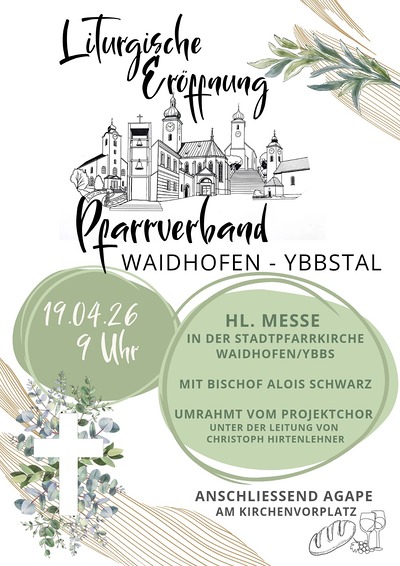 19.04.2026, 09:00 Uhr Bischofsmesse mit offizieller Dekretierung des Pfarrverbandes in der Stadtpfarrkirche Waidhofen Stadtpfarrkirche Waidhofen/Ybbs