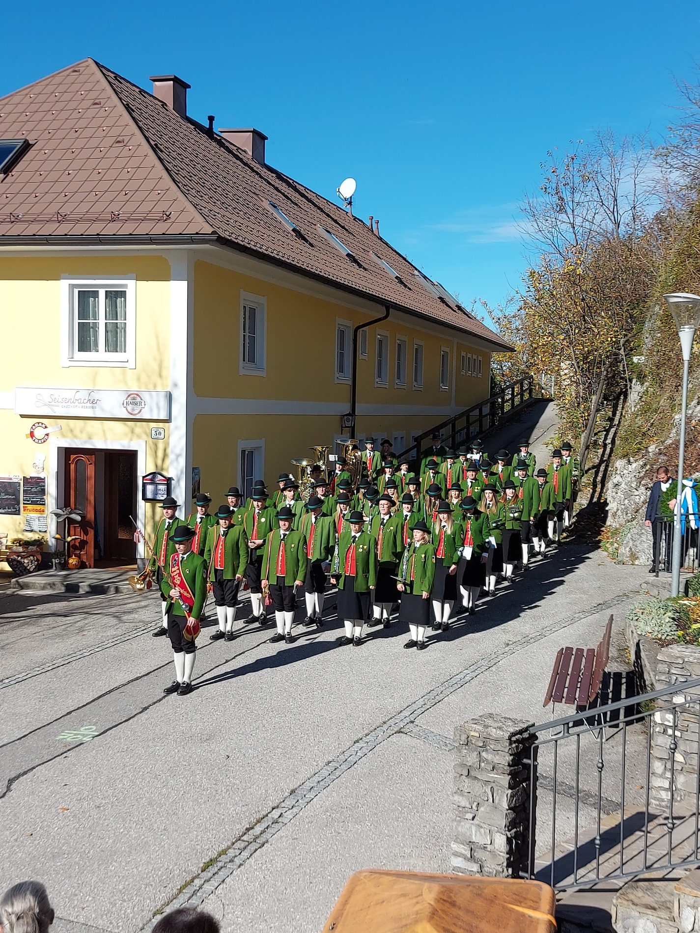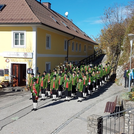 Der Seniorenchor unter der Leitung von Josef Ritt umrahmte heuer den Allerheiligengottesdienst am 1. November. Moderator Martin Talnagi brachte zum Kern des Festes einen bildhaften Vergleich: „Die Heiligen sind die gelebte Sinfonie, gespielt nach der Partitur des Evangeliums.“ Bei mildem Herbstwetter versammelten sich sehr viele zum Gedenken an die Opfer der Kriege und Gewalt am Kirchenvorplatz. Die Trachtenmusikkapelle umrahmte die Feier mit ihren festlichen Klängen. Bürgermeister Werner Krammer fokussierte in seiner Rede sehr stark auf die aktuellen Geschehnisse im Nahen Osten nach dem Terrorüberfall der Hamas auf Israel. Drei Aspekte sprach er als sehr zentral an: die klare Verurteilung der entsetzlichen Terrorakte, wie es alle Parteien im Österreichischen Parlament getan haben, die Thematisierung des Leides der palästinensischen Bevölkerung und das entschiedene Auftreten gegen jeden Antisemitismus. Er sprach sich dafür aus, Gesprächskanäle offen zu halten, auch in Österreich zwischen den Religionsgemeinschaften und der Regierung. „Heute gedenken wir derer, die Opfer von Krieg und Gewalt wurden, weil es keine gelungenen Dialoge gab und daher Konflikte in zerstörerischen Kriegen mündeten. Halten wir voller Demut eine wichtige Tugend der Hoffnung hoch. Die dürfen wir nie aufgeben!“, so die ernsten und mahnenden Worte des Bürgermeisters. Gemeinderat Leopold Brenn und Konrad Schweighuber legten am Kriegerdenkmal den Kranz zu Ehren der dort namentlich genannten Opfer der beiden Weltkriege nieder.